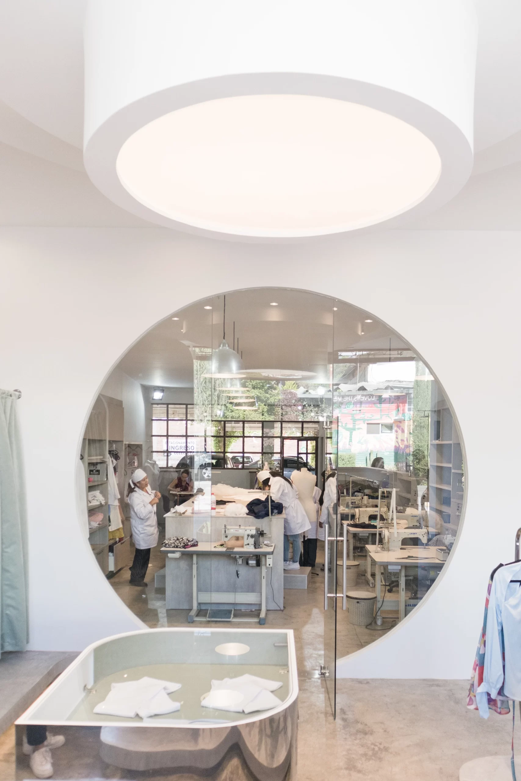 El proyecto parte del movimiento natural de la tela. El showroom se conecta con el taller de manufactura mediante un círculo de vidrio que permite tener transparencia en el proceso de confección.